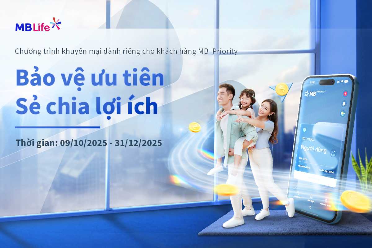 MB Life thông báo Chương trình khuyến mại với tên gọi ” Bảo vệ ưu tiên – Sẻ chia lợi ích” dành riêng cho khách hàng Priority khi tham gia gửi tiết kiệm và mua bảo hiểm theo chương trình “Lãi suất hời – Sống thảnh thơi” của MB Bank.