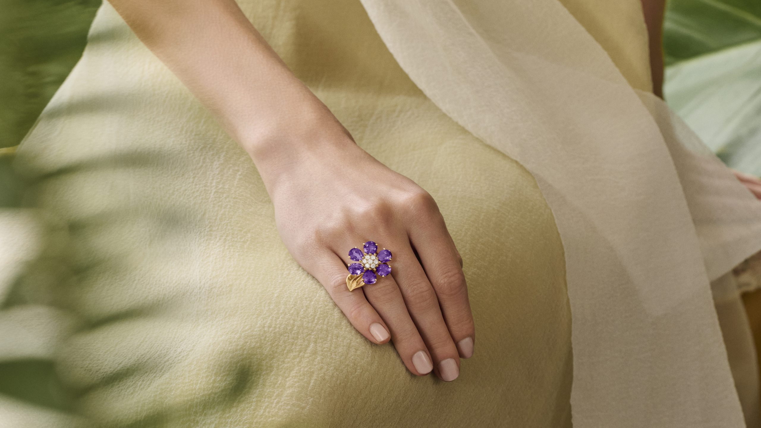 Lấy cảm hứng từ những chuyển động tự do của sáng kiến Passe-Partout năm 1938, Fleurs d’Hawaï tái hiện một khu vườn nhiệt đới tràn đầy nhựa sống. Những viên đá quý được mài giũa kỳ công để hóa thành những cánh hoa mềm mại, vây quanh nhụy hoa kim cương lấp lánh như sương mai. Từ sắc cam nồng của citrine, tím mộng mị của amethyst đến xanh biếc của aquamarine, bảng màu của Fleurs d’Hawaï giống như những mảng màu rực rỡ được thiên nhiên ưu ái ban tặng, nay được ngưng đọng mãi mãi trong ánh vàng sang trọng.